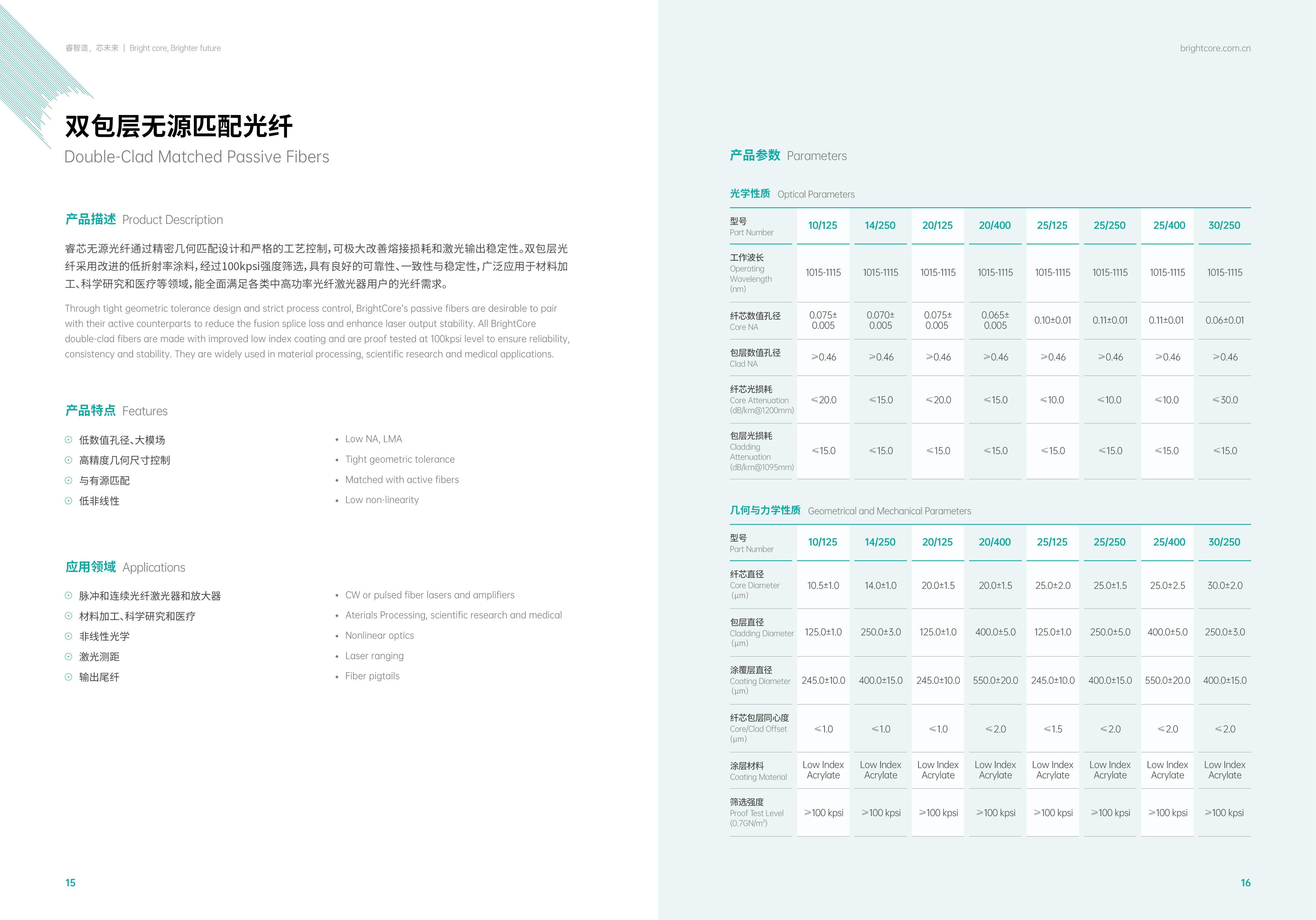 Core passive optical fiber can greatly improve welding loss and laser output stability through precise geometric matching design and strict process control. Double-clad fiber adopts improved low refractive index coating, which has good reliability, consistency and stability after 100kpsi strength screening. It is widely used in material processing, scientific research and medical treatment, and can fully meet the fiber needs of various users of medium and high power fiber lasers.
